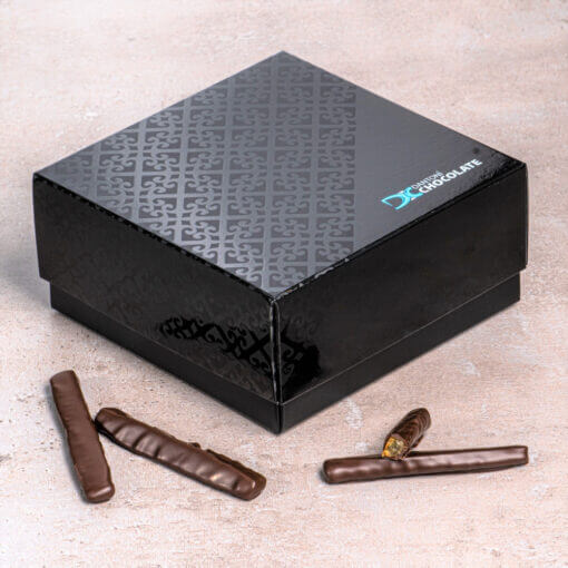 Duplán mártott kandírozott narancshéj és citromhéj, kézműves csokoládéval. Elegáns fekete és aranydobozos kiszerelésben kapható.