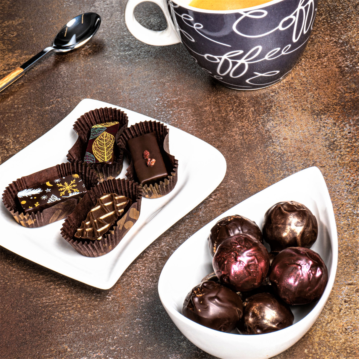 Kézműves bonbonok, trüffelek és duplán mártott kandírozott narancshéj vegyesen többféle csomagolásban.
