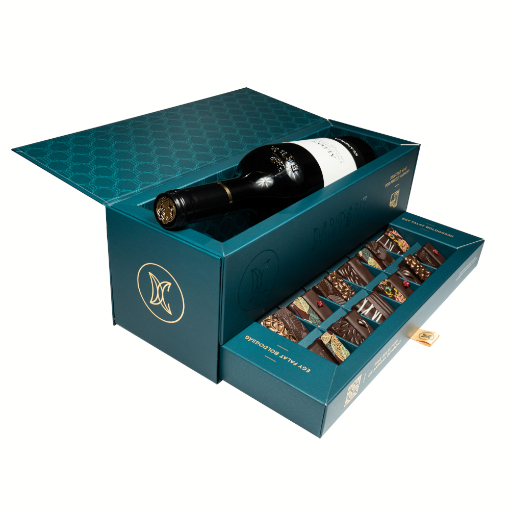 Arannyal prégelt boros doboz fiókjában 24 db kézműves bonbon kapott helyet.