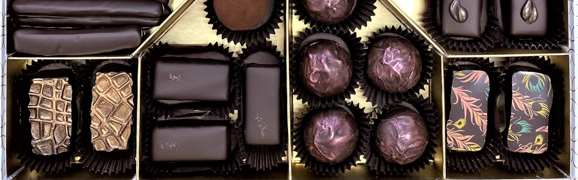 Bonbonok, alkoholos trüffelek és kandírozott narancshéj vegyesen csodaszép artdeco dobozban.