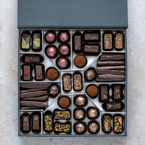 Kézműves bonbonok, alkoholos trüffelek és kandírozott narancshéj elegáns, fekete dobozban.