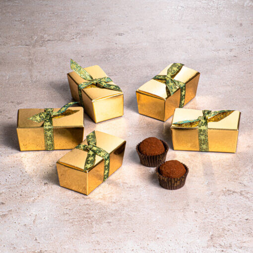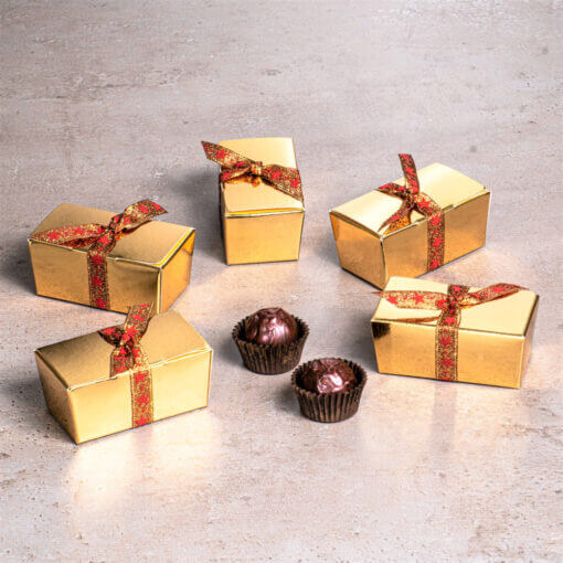 5 db arany ballotin dobozka, mindegyikben 2 db rumos meggyes alkoholos trüffel, arany-bordó szalaggal.