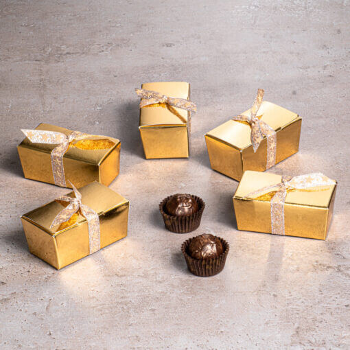 Áfonya, narancs és sok rum – 5 arany ballotin dobozban 2-2 trüffel, arany szalaggal.