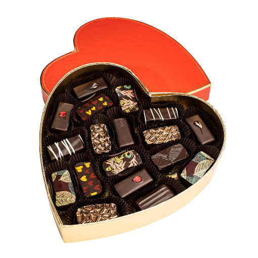 18 db kézműves bonbon piros szívalakú dobozban, elegáns selyemszatén szalaggal átkötve.