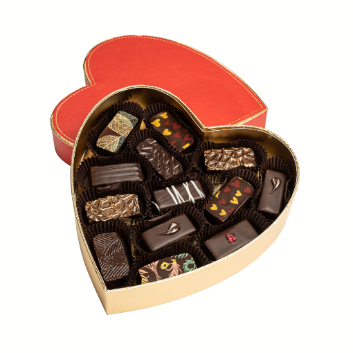 13 db kézműves bonbon válogatás vegyesen exlusive szívalakú dobozban, elegáns selyemszatén szalaggal átkötve.
