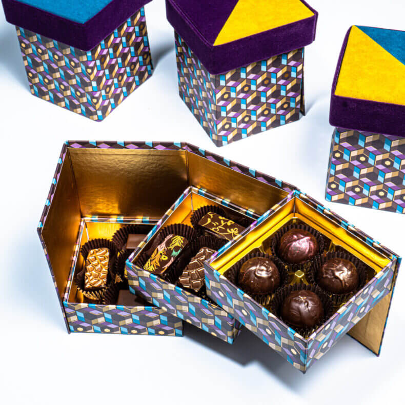 A természet gyümölcseinek tárháza roppanós étcsokoládéba zárva. Legyen az zamatos, édes vagy fűszeres, a kézműves bonbonok ízlelőbimbóid hullámvasútjára váltottak jegyet. Egy falat is elég ahhoz, hogy a lelked felvidítsa. Megtalálod elegáns fekete dobozainkat és ragyogó arany dobozainkat is. Fekete elegáns dobozaink lakozott minta díszíti. Alkalomtól függően kerülnek rá különböző szalagok. Arany és stickbox dobozaink teteje átlátszó, ki se kell bontanod ahhoz, hogy lásd milyen finomságokat rejtenek. Prémium, nagy méretű dobozaink kemény kartonból készülnek, egyediek. Válogass kedvedre csomagolásaink között!