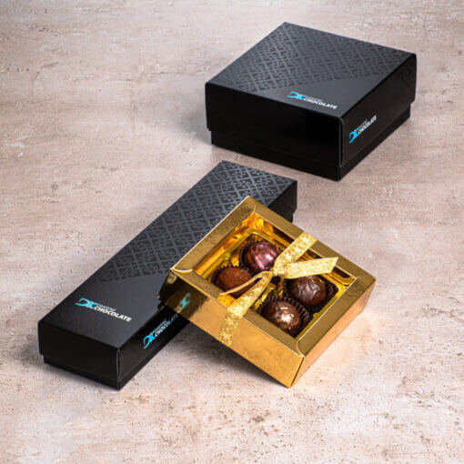 Arannyal prégelt boros doboz fiókjában 24 db kézműves bonbon kapott helyet.