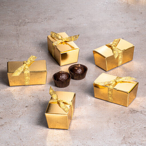 5 db arany ballotin dobozka, mindegyikben 2 db rumos meggyes alkoholos trüffel, arany-bordó szalaggal.