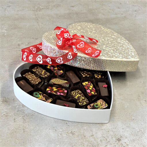 18 db kézműves bonbon válogatás exkluzív szívalakú dobozban, romantikus szalaggal átkötve.